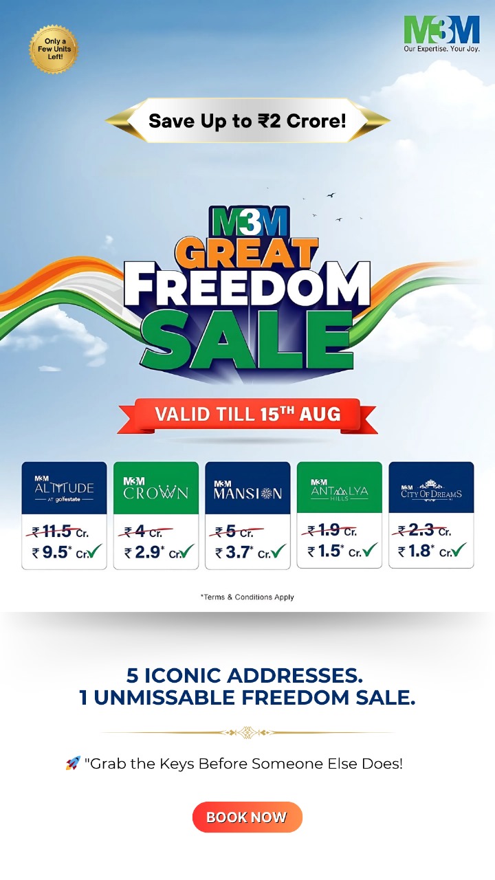M3M India, founded in 2010, is a rapidly growing real estate developer, led by Basant Bansal and supported by Roop and Pankaj Bansal. Known for ethical governance and transparency, the company aims to be a leader in the real estate sector. With around 50 projects in Gurugram and 30 million square feet of saleable space, M3M has delivered numerous residential developments, including award-winning projects like M3M Golfestate and Trump Towers, setting high standards for luxury and quality in India.